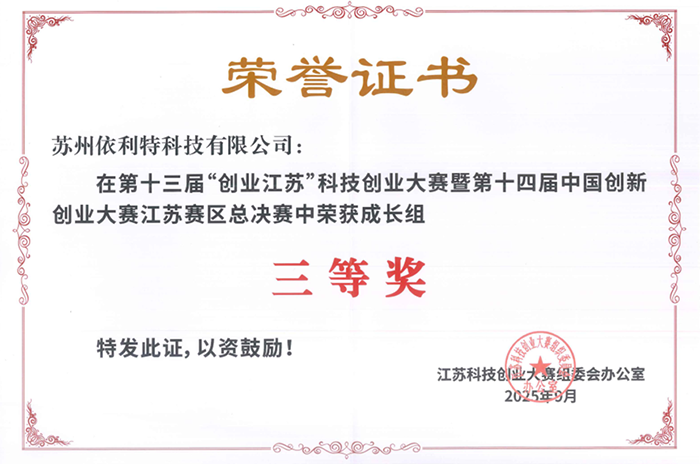 2025年9月23日至24日,第十三屆“創(chuàng)業(yè)江蘇”科技創(chuàng)業(yè)大賽總決賽暨第十四屆中國創(chuàng)新創(chuàng)業(yè)大賽江蘇賽區(qū)總決賽在南京江北新區(qū)圓滿落幕。蘇州依利特科技有限公司榮獲第十三屆“創(chuàng)業(yè)江蘇”科技創(chuàng)業(yè)大賽總決賽暨第十四屆中國創(chuàng)新創(chuàng)業(yè)大賽江蘇賽區(qū)總決賽成長組三等獎。