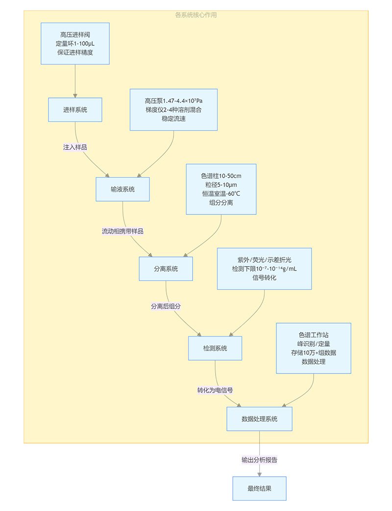 高效液相色譜儀主要由進(jìn)樣系統(tǒng)、輸液系統(tǒng)、分離系統(tǒng)、檢測(cè)系統(tǒng)和數(shù)據(jù)處理系統(tǒng)五大核心部分組成。下面將帶您詳細(xì)了解這五大系統(tǒng)的功能與特點(diǎn)。