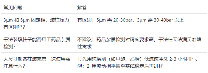 小粒徑(<20μm)用濕法,大粒徑(>25μm)用干法;分析柱用標(biāo)準(zhǔn)濕法,制備柱(>20mm)加壓縮;裝完必測柱效,不合格就重裝。