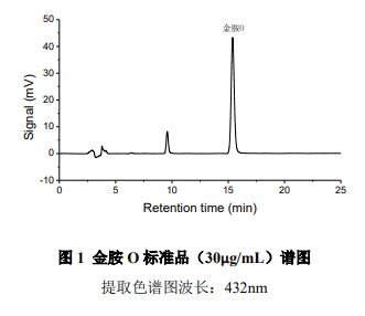 按照《中藥材及中藥飲片藥品檢驗補充檢驗方法和檢驗項目批準(zhǔn)件》食藥監(jiān)稽函 [2012] 200 號文件中金胺 O 檢測方法,使用大連依利特分析儀器有限公司配置 DAD230 + 二極管陣列檢測器的高效液相色譜儀可以分析檢測中藥材和中藥飲片中的金胺 O,系統(tǒng)穩(wěn)定重復(fù),線性相關(guān)性良好,檢出限低,通過光譜圖比對、峰純度計算功能,能夠準(zhǔn)確定性,避免假陽性現(xiàn)象,滿足藥監(jiān)部門制定的標(biāo)準(zhǔn)要求。
