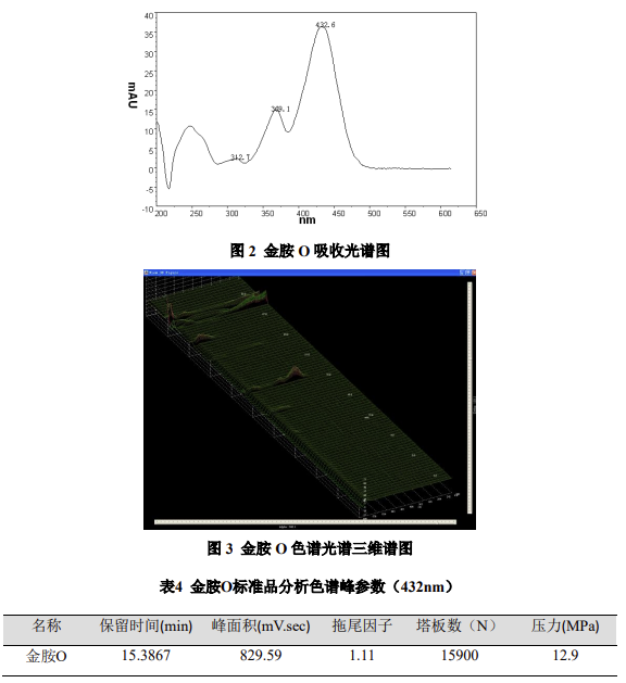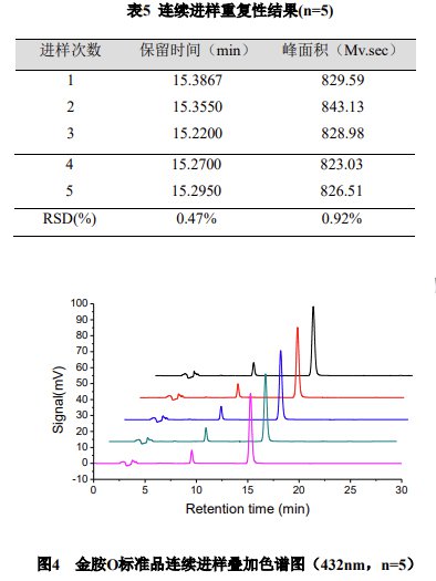 連續(xù)進樣 5 次,計算金胺 O 色譜峰保留時間和峰面積的 RSD 值,均小于 1%。