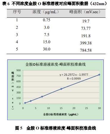 配制濃度分別為 0.75μg/mL、3.0μg/mL、7.5μg/mL、15.0μg/mL、30.0μg/mL 的金胺 O 標(biāo)準(zhǔn)工作溶液,按濃度由低至高進樣,以標(biāo)準(zhǔn)品濃度為橫坐標(biāo),峰面積為縱坐標(biāo),繪制校準(zhǔn)曲線。結(jié)果顯示,金胺 O 線性相關(guān)系數(shù)達 0.9999 (表 6、圖 5)。