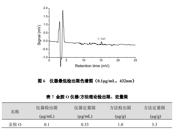 以峰高約為 3 倍信噪比對應(yīng)濃度為儀器檢出限,以 10 倍信噪比計算儀器定量限,噪聲按 0.05mV 計算,金胺 O 儀器 / 方法理論檢出限、定量限結(jié)果如下。