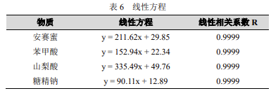 配制濃度分別為 5μg/mL、10μg/mL、20μg/mL、30μg/mL、40μg/mL、50μg/mL、100μg/mL 的標(biāo)準(zhǔn)工作液,按濃度由低至高進(jìn)樣,以標(biāo)準(zhǔn)品濃度為橫坐標(biāo),峰面積為縱坐標(biāo),繪制校準(zhǔn)曲線,安賽蜜、山梨酸、糖精鈉混合標(biāo)準(zhǔn)品的線性相關(guān)性結(jié)果如下: