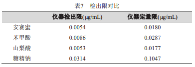 噪聲按 0.01mV 計算,峰高為 3 倍信噪比對應(yīng)的濃度為儀器檢出限,10 倍信噪比對應(yīng)的濃度為儀器定量限,結(jié)果如下表所示:
