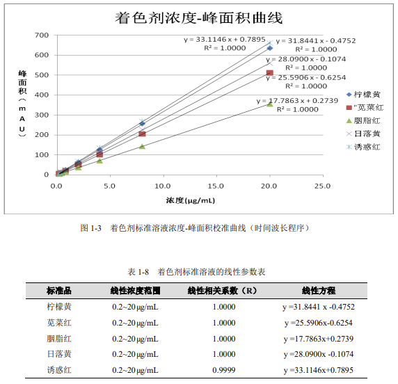 配制濃度分別為 0.2μg/mL、0.4μg/mL、0.8μg/mL、2.0μg/mL、4.0μg/mL、8.0μg/mL、20.0μg/mL 的著色劑混標工作液,按濃度由低至高進樣,以標準品濃度為橫坐標,峰面積為縱坐標,繪制校準曲線,著色劑的標準溶液線性相關(guān)性結(jié)果如下。