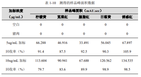 采用方法中描述的前處理過程,對空白、豬肉樣品以及加標樣品進行處理后,采集數(shù)據(jù),并計算所對應(yīng)的加標回收率結(jié)果見表 1-10。