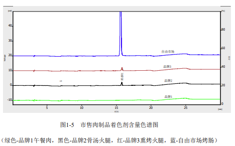 按照上述方法對市場上的幾種肉制品中著色劑的含量情況分析結(jié)果如下: