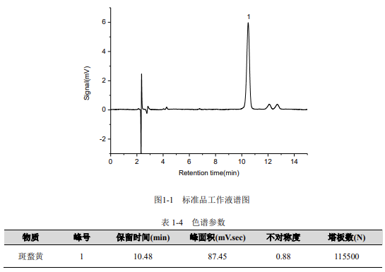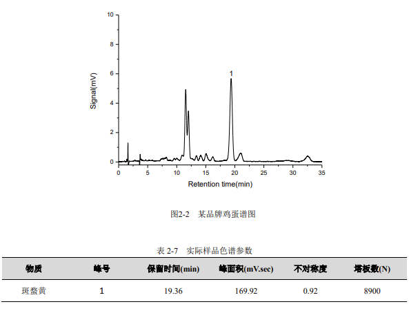 (圖 2-1 標(biāo)準(zhǔn)品工作液譜圖,橫坐標(biāo)為 Retention time (min),范圍 0-35,縱坐標(biāo)為 Signal (mV),范圍 0-25,圖中斑蝥黃對應(yīng)峰的保留時間約為 19.45min)
