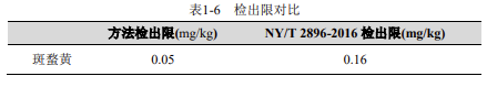 通過上述色譜數(shù)據(jù)及線性方程計算,某品牌雞蛋中斑蝥黃含量為 2.4 mg/kg。