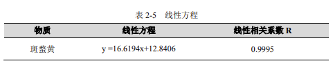 配制濃度分別為 1μg/mL、2μg/mL、5μg/mL、25μg/mL、100μg/mL 的標(biāo)準(zhǔn)工作液,按濃度由低至高進(jìn)樣,以標(biāo)準(zhǔn)品濃度為橫坐標(biāo),峰面積為縱坐標(biāo),斑蝥黃線性相關(guān)性結(jié)果如下。