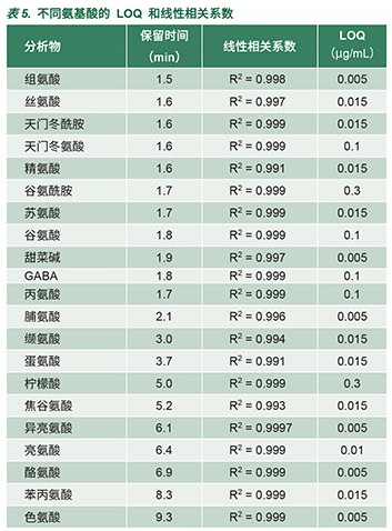 線(xiàn)性與檢出限:所有氨基酸線(xiàn)性相關(guān)系數(shù) R2 均 > 0.98(部分如天門(mén)冬酰胺 R2=0.999),LOQ(定量限)低(低 0.005μg/mL,如組氨酸、甜菜堿、脯氨酸等),滿(mǎn)足微量分析需求(詳見(jiàn)表 5);