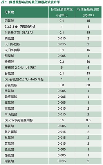 乙腈、甲酸、氨基酸標(biāo)準(zhǔn)品、氘化氨基酸標(biāo)準(zhǔn)品(內(nèi)標(biāo))、去離子水(由 Triple Red 水純化儀制備)