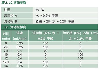 LC 參數(shù):柱溫 30℃;流動(dòng)相 A 為 “水 + 0.2% 甲酸”,流動(dòng)相 B 為 “乙腈 + 2% 水 + 0.2% 甲酸”;梯度洗脫程序按時(shí)間調(diào)整流速與 A/B 比例(詳見(jiàn)表 2);