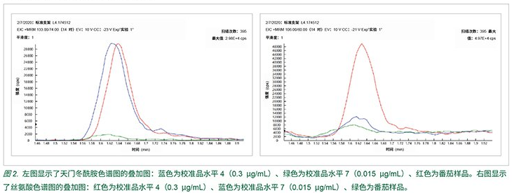 代表性數(shù)據(jù):天門(mén)冬酰胺、絲氨酸等氨基酸的校準(zhǔn)曲線(xiàn)線(xiàn)性?xún)?yōu)異(見(jiàn)圖 1),不同濃度校準(zhǔn)品與番茄樣品的色譜圖重疊度高,分離效果清晰(見(jiàn)圖 2)。