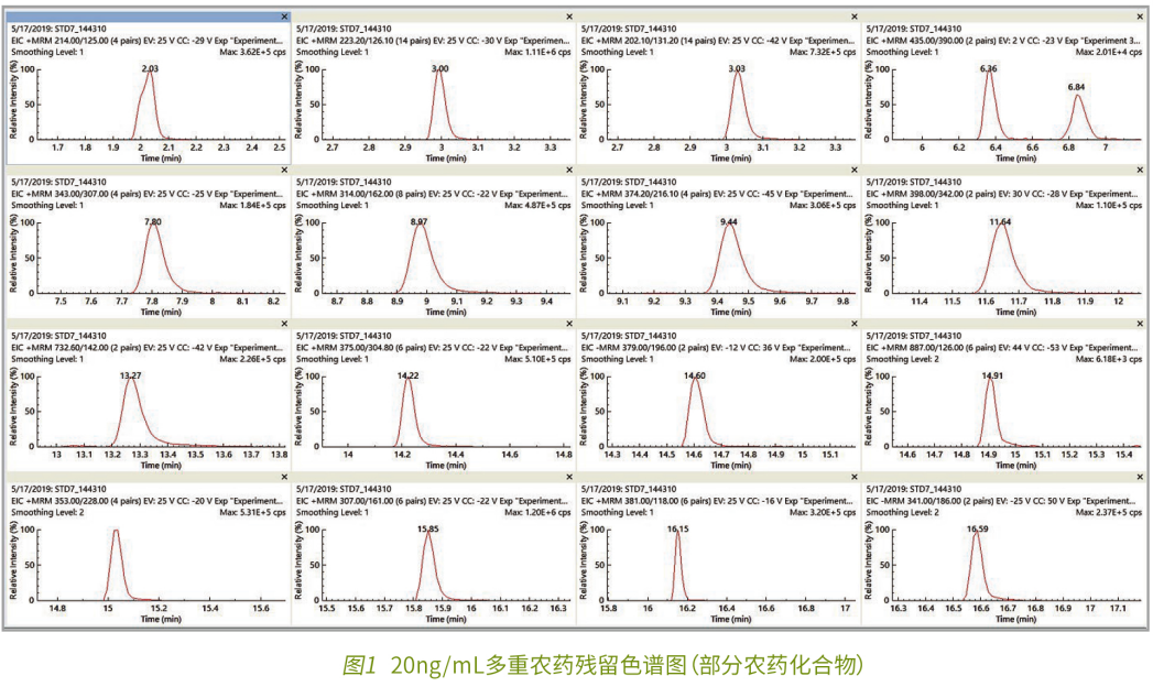 在上述實驗條件下得到數(shù)種農(nóng)藥化合物的 MRM 色譜圖,見圖 1。