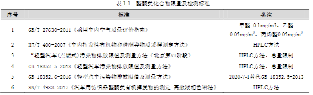 以下標準分別對汽車尾氣、內(nèi)飾、車內(nèi)空氣限量標準 / 檢測方法進行了規(guī)范,以盡量減少醛酮化合物的污染: