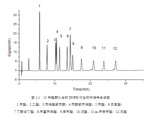 按照第 1.3 中實驗方法對 13 種醛酮化合物 DNPH 衍生物進行檢測,典型分離譜圖如下: