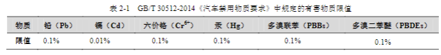 隨著經(jīng)濟的發(fā)展,人們對汽車的安全性、舒適性要求逐漸提高,對汽車生產(chǎn)中使用的有毒有害物質(zhì)限量要求也越來越嚴格。多溴聯(lián)苯和多溴二苯醚作為常用的阻燃劑,在汽車車體和內(nèi)飾中廣泛存在。GB/T 30512-2014 《汽車禁用物質(zhì)要求》對汽車零部件的禁用有害物質(zhì)的含量限值進行了要求,詳見下表: