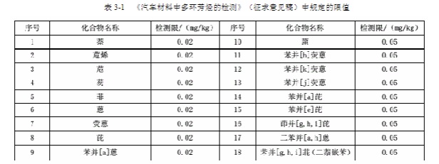 汽車內(nèi)有多種物質(zhì)可能向車內(nèi)釋放多環(huán)芳烴,如汽車的配件 (坐墊、座椅套)、車內(nèi)飾 (門內(nèi)護板) 以及生產(chǎn)車時使用的油漆、稀釋劑、粘合用的膠水,甚至一些劣質(zhì)的香水、空氣凈化劑等,都可能含有多環(huán)芳烴。全國汽車標準委員會 2019 年 5 月 13 日公布了《汽車材料中多環(huán)芳烴的檢測》(征求意見稿),該標準是新制定的行業(yè)標準,將作為 GB30512《汽車禁用物質(zhì)要求》的修訂版配合標準實施,預(yù)計 2020 年開始執(zhí)行。