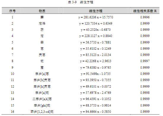 將 16 種多環(huán)芳烴標準工作溶液,按 3.3 中色譜條件進行分析,16 種多環(huán)芳烴線性如下表所示。