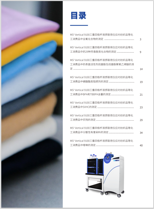 文集覆蓋紡織品等化工消費(fèi)品中 9 大類(lèi)高關(guān)注度物質(zhì)的檢測(cè),適配不同基質(zhì)與法規(guī)要求,具體包括: