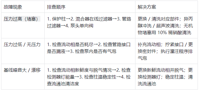 平時多注意預(yù)防,能少出很多故障。要是遇到壓力過高(大概率是堵塞了),可以按照這個順序檢查和清洗:先檢查保護柱,該換就換、該洗就洗;然后是混合器里的在線過濾器,拆下來清洗干凈;接著是管路過濾器,同樣檢查清洗;后是泵頭單向閥,要是堵了,用異丙醇沖洗,或者放超聲波里用異丙醇清洗,要是無機物堵塞,還能用 10% 的稀硝酸清洗。?