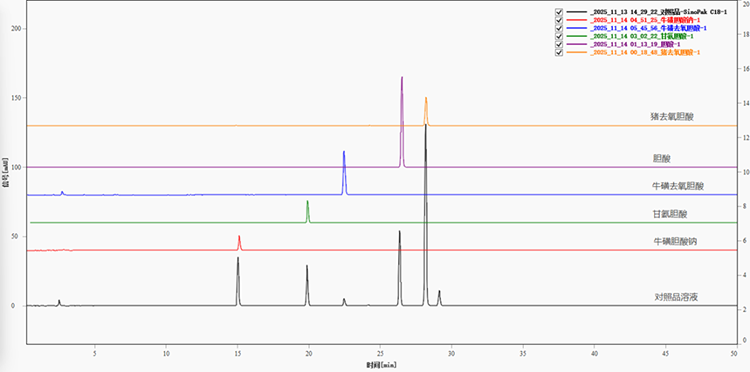 圖1顯示了人工牛黃膽酸類系統(tǒng)適用性溶液在SinoPak C18色譜柱上的分離色譜圖。圖中四個色譜峰(依次為牛磺豬去氧膽酸、牛磺膽酸鈉、鵝去氧膽酸、脫氧膽酸)基線分離良好,峰形尖銳對稱,直觀表明該色譜系統(tǒng)對這幾類結構相似的化合物具有優(yōu)異的分離能力。圖3為系統(tǒng)適用性溶液及對應單標在SinoPak C18色譜柱上分離的疊加色譜圖,進一步證實了系統(tǒng)適用性溶液與對照品溶液中對應峰的一致性。